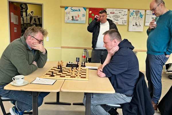 Die knappe Führung hatte auch Bestand, als Martin in Verluststellung erfolgreich auf dreimalige Stellungswiederholung reklamierte. Leider hatte ich in der Zeitnotphase in schwieriger Stellung einen Bauern eingestellt, der meinem Gegner zum Gewinn der Partie genügte. Danke an den Schiri Franz Schulze Bisping, der noch am Spieltag einige Fotos und die Notation der Partien übersandte, die Sie weiter unten nachspielen können.