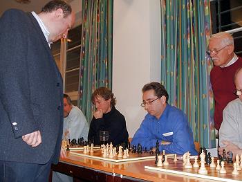 Im Rahmen unseres Vereinsfestes zum 75jährigen Jubiläum trat Vladimir Chuchelov zu einem Simultanwettkampf an 20 Brettern an. Unter den Gegnern waren Spieler aller SFK-Mannschaften vertreten, am Ende der harmonischen Veranstaltung konnten sich drei Schachfreunde über einen Teilerfolg freuen: Werner Nautsch, Ulrich Geilmann und Markus Kontny schaften immerhin ein Remis. Auch seinem Sohn Alexander, der von der charmanten Mutter beraten wurde, schenkte Vladimir keinen (halben) Punkt.