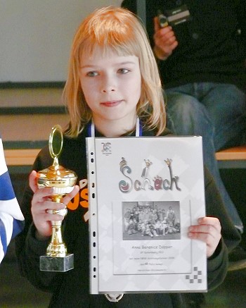 "Ich möchte doch mal versuchen, an der deutschen Meisterschaft teilzunehmen. Dafür kriege ich ja sogar schulfrei!" - diesem Vorsatz ließ Anna Bérénice seit dem Januar dieses Jahres auch Taten folgen: Sie spielte bei jeder sich bietenden Gelegenheit und trainierte fleißig im Verein und zu Hause. Trotzdem kassierte die Neunjährige beim erstmals ausgetragenen Sichtungsturnier der Schachjugend NRW zum Auftakt zwei Niederlagen.
