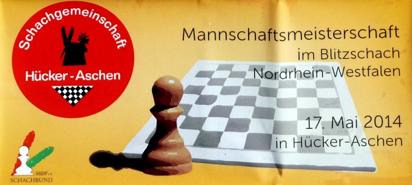 Nach langer Pause konnte unser Verein sich in diesem Jahr wieder für die NRW-Blitzmannschaftsmeisterschaft qualifizieren. Ein Quartett bestehend aus Bernd Rosen, Dr. Christian Scholz, Dr. Thomas Wessendorf und Holger Stratmann machte sich auf den Weg nach Hücker-Aschen. Dieses Dorf gehört zur Stadt Spenge, und die älteren Spieler der Mannschaft (also eigentlich alle) erinnerten sich noch gut an die Zeiten, als Enger-Spenge noch in der Bundesliga spielte. Hücker-Aschen ist offensichtlich ein sehr schachbegeisterter Flecken - am Ortseingang warb ein großes Transparent für diese Blitzmeisterschaft. Auch sonst war das Turnier liebevoll organisiert, jeder Teilnehmer erhielt sogar eine eigens gestaltete "Meisterschaftsschokolade". Allenfalls der Spielsaal war für die 21 teilnehmenden Mannschaften etwas klein geraten.