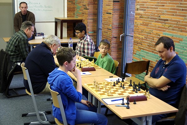 Wie man Kämpfe gewinnt, das zeigte unsere 7. Mannschaft den beiden Trainern Volker Gassmann und Bernd Rosen, die sich im Nebenraum mit SFK 2 im NRW-Klassenkampf gegen Herford sehr schwer taten: Auch ohne die beiden Spitzenbretter Achim Kühn und Markus Kontny gewann die reine Jugendauswahl gegen Holsterhausen 4 mit 5:1. Lediglich Jonas Griebel musste sich dem Holsterhausener Trainer Rainer Blum (DWZ knapp 1900) geschlagen geben. Vor allem Isabel Otterpohl erntete für ihre Partie viel Lob - eine Abwicklung, mit der ihr Gegner die Dame gewinnen wollte, hatte sie besser berechnet, und auch im anschließenden Endspiel fand sie einen sehr überzeugenden Weg zum schnellen Gewinn. Alle Ergebnisse stehen im NRW-Ergebnisportal, Fotos von Bruno Müller-Clostermann:
