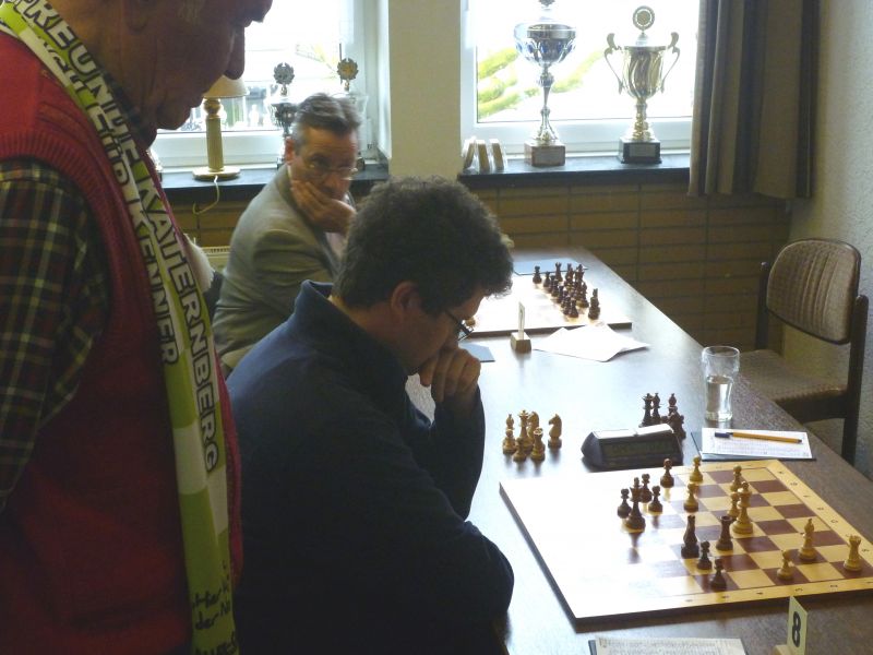 Der erwartet spannende Kampf begann mit einer Remisserie: Axel Cremerius und Herbert Schmitthöfer vereinbarten an den Brettern 7 und 8 rasch ein Remis, gefolgt von Günter Liszka am Spitzenbrett. Es folgte ein klarer Endspielsieg von mir und nur wenige Minuten danach zwang unser Käpt'n Stefan Zell seinen Gegner mit einer undeckbaren Mattdrohung zur Aufgabe. Klasse herausgespielt, Stefan! Dein schwarzer Bauer auf f3 sah einfach so schön aus. Überlegenes Positionsspiel, das Matt folgt dann von selbst.