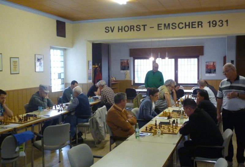 Der Mannschaftskampf bei Horst-Emscher begann mit zwei relativ schnellen Siegen von Lukas Schimnatkowski und Jürgen Riesenbeck, die allerdings anfangs etwas bedenklich standen. Lukas hatte in einem Katalanen den c4-Bauern gegeben und Schwarz hatte am Damenflügel das übliche c6-b5-c4-Bollwerk aufgebaut, ohne dass Kompensation zu erkennen war. Wie Lukas einen Angriff starten konnte, der innerhalb von 3-4 Zügen zwei Figuren gewann und den schwarzen König direkten Mattdrohungen aussetzte, habe ich auch rückblickend noch nicht verstanden. Gegen Jürgen Riesenbecks König (gut gelaunt aus Griechenland zurück! Jürgen, nicht der König!) braute sich ein Mattangriff zusammen, aber irgendwie schaffte er es, aus seinem schlechten Läufer auf d7 einen ziemlich guten zu machen und vor allem dessen Gegenspieler in Form eines weißen Springers rückstandslos zu beseitigen. Auch hier weiß ich nicht, was da wie passiert war. Erster Zwischenstand 2:0!