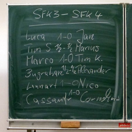 Wie im Vorjahr starten wir auch in diesem Jahr mit zwei U20 - Mannschaften in der Jugendbezirksliga. Diese spielten in der ersten Runde erwartungsgemäß gegeneinander, und ebenso erwartungsgemäß behielt SFK3 mit 5:1 klar die Oberhand. Dieses eindeutige Ergebnis täuscht aber darüber hinweg, welchen hartnäckigen Widerstand die Außenseiter leisteten. Die längste Partie dauerte 3 Stunden und endete mit einem ausgekämpften Remis zwischen Bugrahan Corak und Alexander Tipp in einem lehrreichen Endspiel. Das zweite Remis trotzte ein überraschend umsichtig agierender Marius Schimnatkowski dem erfahrenen Tim Scholten ab.