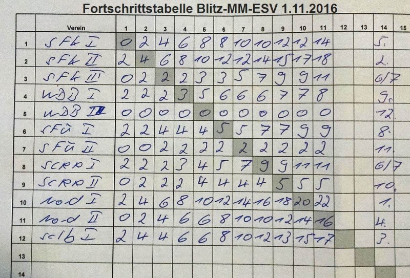 Mit drei SFK-Mannschaften mit je 5 Spielern wollten wir die Bezirksmeisterschaften im Mannschaftsblitz bestreiten. Als es um 11:15 Uhr mit der üblichen "akademischen Viertelstunde" losging hatten wir für SFK I und SFK III doch nur vier Spieler, wohingegen SFK II mit Timo, Volker, Max, Lukas und Bernd [Sauer] in jeder Hinsicht mit "voller Kapelle" antreten konnte. Es kam wie es kommen musste: In Runde 1 gewann SFK II gegen das favorisierte Team von SFK I mit 2,5:1,5! In der Folge gab es nur eine Niederlage gegen MH-Nord 1 (mit IM Zelbel und GM Hausrath an den Spitzenbrettern) und zwei Unentschieden gegen die Listigen Bauern und Weiße Dame Borbeck 1.