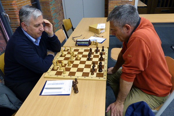 Unser Spitzenbrett Bosko Tomic schaut recht missmutig drein auf dem Bild - verloren hat er aber nicht. Die Partie mündete schnell in ein Endspiel mit ungleichfarbigen Läufern. Anstatt auch das letzte Turmpaar zu tauschen und mit gleichen Bauern sofort Remis zu machen spielte er lieber mit Türmen und einem Minusbauern weiter - am Ende wurde es trotzdem Remis. "Das hätten die schon viel früher haben können!" merkte ein Kiebitz an. "Die spielen eben gerne Schach!" hielt ich ihm eine mögliche Erklärung entgegen.