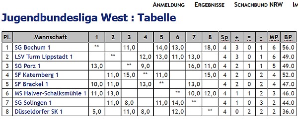 Nach dem deutlichen und verdienten Sieg gegen den Serienmeister und bisherigen Tabellenführer Porz ist in der Jugendbundesliga auf einmal wieder alles offen: Vom neuen Spitzenreiter Bochum bis Brackel auf Platz 5 haben alle Mannschaften in den letzten 3 Runden die Chance ganz oben zu landen. Dabei spielen wir und Brackel noch 2X gegen Mannschaften der unteren Hälfte, während Bochum, Lippstadt und Porz nominell das schwerere Restprogramm haben. In jedem Fall bestehen gute Chancen auf Qualifikation für die Deutsche Meisterschaft.