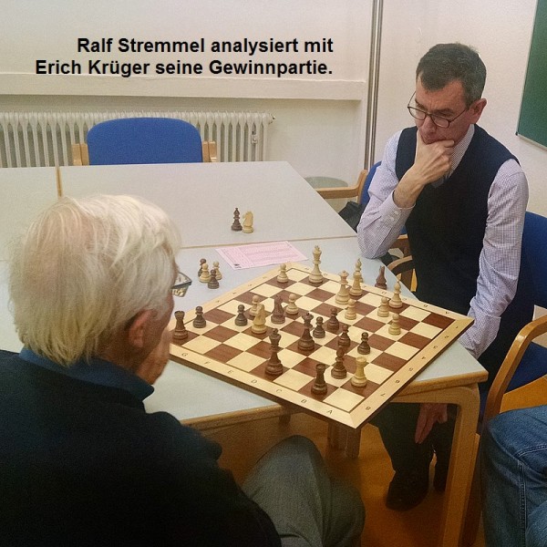 Weitere volle Punkte gab es durch die beiden Weißsiege von Ralf Stremmel an Brett 5 in einer komplexen und durchgängig mit Druck und Vorteil geführten Partie sowie von Bernd Dahm an Brett 1, dem es gelungen war zuerst einen sehr gesunden Bauern und dann langsam aber sicher auch das Endspiel zu gewinnen. Längste Partie des Tages!