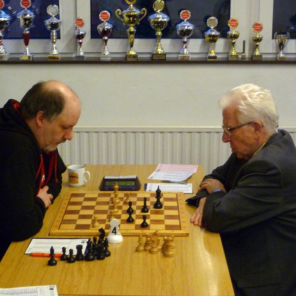 Nach dem hart erkämpften Remis von Jürgen Riesenbeck (SF Katernberg) gegen Heinrich von Bünau (Düsseldorfer SK und in Essen-Werden geboren!), vgl. Foto und dem Sieg von Helmut Hassenrück (SG Gladbeck) gegen Friedhelm Dahlhaus (DJK Wacker Bergerborbeck) bilden die Beiden mit 4,5 Punkten aus 5 Runden das Führungsduo und spielen morgen an Tisch 1 gegen einander.