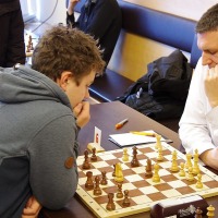 Trotz Mehrfigur schien er wegen seinem eingeklemmten Damenflügel und drohendem gegnerischen Aufmarsch in prekärer Situation zu sein, konnte aber mit dem kräftigen Damenzug nach f4 - ein Pseudodamenopfer! - die gegnerische Dame fesseln, zwei weiße Figuren auf d6 und e2 gleichzeitig angreifen und sich völlig konsolidieren. Nach der verzweifelten Antwort Le2-c4 (vgl. Bild) folgte Dxd6, später dann Abwicklung und nach nur wenigen weiteren Zügen gab es den vollen Punkt für Nikita. Zwischenstand 1,5:0,5 aus Katernberger Sicht. Ein Super-Comeback des immer stärker werdenden Nikita, der der Mannschaft in den Runden 3-7 leider nicht zur Verfügung stehen konnte.