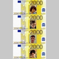 Renate Oversohl, engagierte Mannschaftsführerin von SFK 8 und über Jahre hinweg "Fahrerin vom Dienst" bei ungezählten Jugendturnieren, hatte die Idee, einen individuellen "2000er" gestalten zu lassen, der als Zahlungsmittel natürlich weder im Geschäftsleben noch in der Schachwelt akzeptiert wird. Hier alle 2000er im Bild: