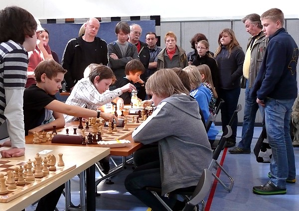 56 Kinder beteiligten sich an den SVR-Einzelmeisterschaften der Altersklassen U10 und U12 in der Zeche Helene und ermittelten in spannenden Kämpfen ihre Meister. In der U10 lagen nach 7 Runden drei Spieler punktgleich an der Spitze, die Feinwertung gab den Ausschlag für Daniel Kasanzew (Dortmund Brackel) vor Paul-Luca Wübker (Castrop Rauxel) und Nikolaj Kartsev (Dortmund-Brackel). Die U12 dominierte überraschend der noch DWZ-lose Lucas Clauß (SK Langendreer/Werne) mit 8 Punkten aus 9 Partien, punktgleich dahinter folgten Daniel Kantor (Berghofen-Hörde) und Daniel Schüler (Listiger Bauer). Beste Mädchen wurden Mareike Wastian in der U10 und Julia Walker in der U12. Ein ausführlicher Bericht folgt, hier vorab Fotos und Tabellen: