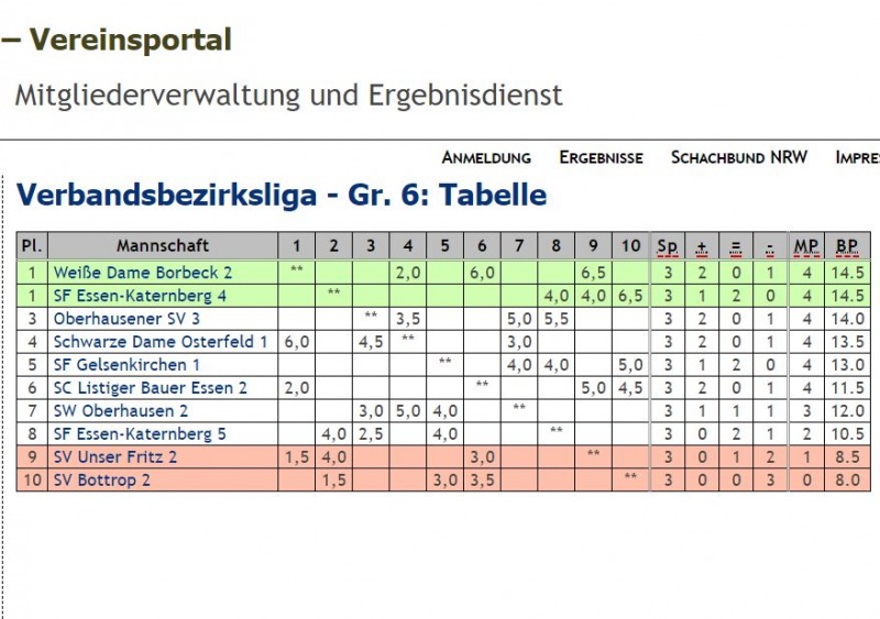 Nach drei Runden stehen sechs Mannschaften punktgleich mit 4:2 Mannschaftspunkten vorne, SFK 4 ist mit dabei und sogar mit 14,5 Brettpunkten gleichauf mit Weiße Dame Borbeck 2 auf den beiden Aufstiegsplätzen.