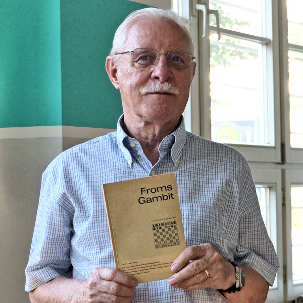 Vom Mannschaftsschach zog Dieter Deppe sich schon vor vielen Jahren zurück - das war ihm zu nervenaufreibend. Doch wenn im Verein etwas los war - und das war ja fast immer der Fall! - war Dieter als engagierter Zuschauer dabei. Schachlich war er ein treuer Anhänger "seiner" Eröffnungen: Mit Schwarz vertraute er der französischen Eröffnung, als Weißer eröffnete er stets mit dem extravaganten Zug f2-f4. Ein schönes Beispiel dafür, dass wir am Schachbrett Seiten unserer Persönlichkeit ausleben können, die im realen Leben eher nicht zum Tragen kommen. Sicher hätte niemand dem sonst so auf Sicherheit bedachten Dieter eine so "unkorrekte" Eröffnung zugetraut. Doch diese Spielweise war ihm mehr oder weniger familiär vorgegeben, denn sein Onkel Dr. Georg Deppe widmete dieser Spielweise und insbesondere dem scharfen Gambit 1.f4 e5 eingehende Untersuchungen, die sogar in eine Buchveröffentlichung mündete. Auf dem nebenstehenden Foto posiert Dieter mit einer Ausgabe dieses Werkes. Aufgenommen wurde es 2015, als wir im Rahmen unserer Reihe Sommerschach das From's Gambit erprobten.