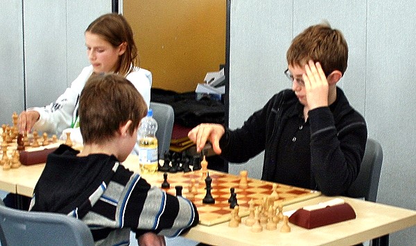 Die übrigen Altersklassen spielten ein gemeinsames Turnier mit 18 Teilnehmern, wodurch sich ein hoch interessanter Wettbewerb mit vielen spielstarken Vereinsspielern ergab. Nachdem sich zu Beginn alle Favoriten klar durchsetzen konnten, brachte schon die 2. Runde die erste Überraschung: Gregor Hein (Don-Bosco-Gymnasium / WD Borbeck) knöpfte dem für den SV Welper startenden Patrick Marx (Gymnasium Essen-Überruhr) einen halben Punkt ab. Ab der 4. Runde wurde es dann richtig spannend: Gregor Hein besiegte den Turnierfavoriten Jan Dette (Leibniz-Gymnasium / SFK) in einer überlegen geführten Partie, gleichzeitig bezwang Maximilian Heldt (Burggymnasuium / SFK) im Verfolgerduell Patrick Marx. In der 5. Runde siegte Maximilian Heldt im Spitzenduell gegen Gregor Hein, gleichzeitig hielt Jan Dette mit einem Erfolg gegen seinen Bruder Tim (Leibniz-Gymnasium / SFK) Anschluss an die Spitze. Die Spitzenpaarung der 6. Runde endete mit einem Remis: Maximilian Heldt, im Mehrbesitz eines ganzen Turmes, fand keinen Weg aus Jan Dettes Dauerschach. Dadurch konnten Clemens Waidelich (Leibniz-Gymnasium / SFK) und Patrick Marx den Abstand auf Maximilian Heldt bis auf einen halben Punkt verringern.