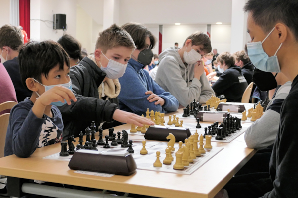 Doch wir hatten noch eine zweite Mannschaft vor Ort: Für die U16-Meisterschaft im Ruhrgebiet gab es nur einen Bewerber - kurzfristig konnten wir eine Mannschaft melden, für die es "nur" um ein hartes Training gegen starke Gegnerschaft ging. Am meisten imponierte mir, wie Minh als jüngster Spieler dieses Turniers die Herausforderung annahm. Er holte zwei Remisen, wobei er einmal selbständig das Motiv der Türme auf der 2. Reihe entdeckte, die ein Dauerschach garantieren. In der anderen Remispartie kam er leider nicht auf den Gedanken, seinen Läufer für einen Tempozug zu nutzen, weshalb er ein Endspiel König plus Bauer und Läufer gegen König und Bauer nicht gewinnen konnte. Aber auch die Lukas R., Sam und Jonathan holten sich ihre Erfolgserlebnisse ab, außer dem kampflosen Punkt holte das Team noch einen Sieg und ein Unentschieden, was immerhin für Platz 13 reichte. Auch hier die Einzelergebnisse: