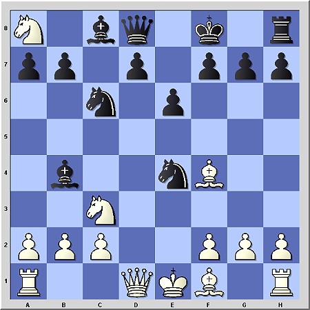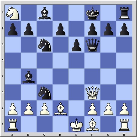 1.e4 c5 2.Sf3 e6 3.d4 cxd4 4.Sxd4 Sf6 5.Sc3 Sc6 6.Lf4 [Hauptvariante ist hier 6.Sdb5 Lb4 7.a3 Lxc3+ 8.Sxc3 d5 9.exd5 exd5] 6...Lb4 [6...d6 7.Sdb5 e5 8.Lg5 a6 führt zum Sweschnikow-System, welches gegenwärtig als sichere Remisvariante gegen e4 von Weiß fast genauso gefürchtet wird wie Russisch oder Marshall Gambit.] 7.Sdb5 Sxe4 8.Sc7+ [Besser ist das auf GM-Niveau oft gespielte Df3 z.B. 8.Df3 d5 9.0–0–0 Lxc3 10.Sc7+ Kf8 11.bxc3 e5! 12.Sxd5 Sg5 mit großen Verwicklungen.] 8...Kf8! [8...Ke7? 9.Df3 d5] 9.Sxa8?