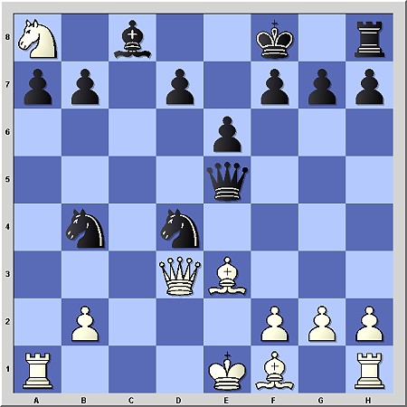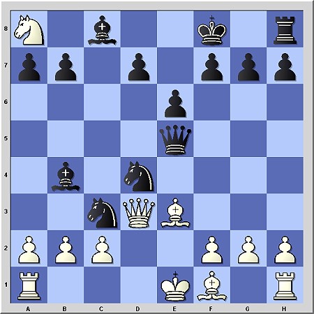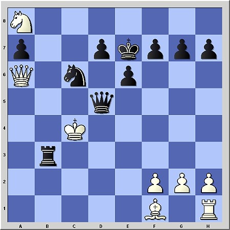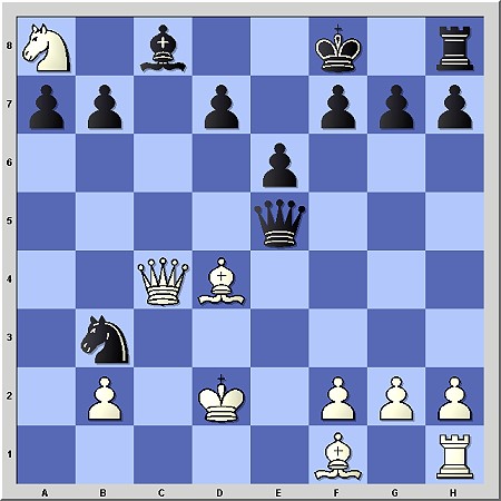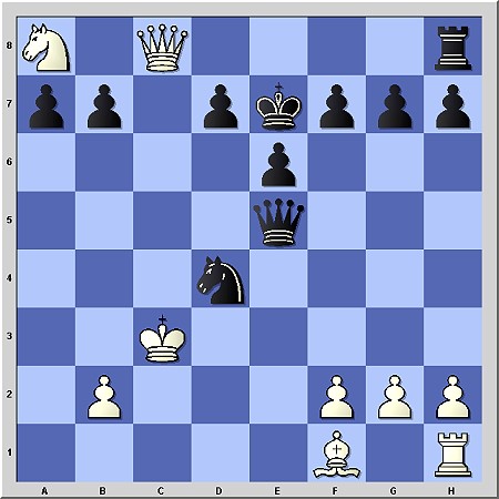 22.Dxb7?? [22.Dxh8 Sf3+ mit Remis durch Dauerschach. Nun hat Schwarz noch den Turm zum Mattsetzen:] 22...Sc6+–+ 23.Kc2 Tb8 24.Da6 Txb2+ 25.Kd1 Tb1+ 26.Kd2 De1+ 27.Kc2 Dd1+ 28.Kc3 Tb3+ 29.Kc4 Dd5#