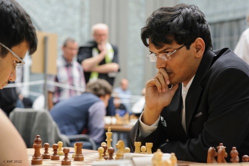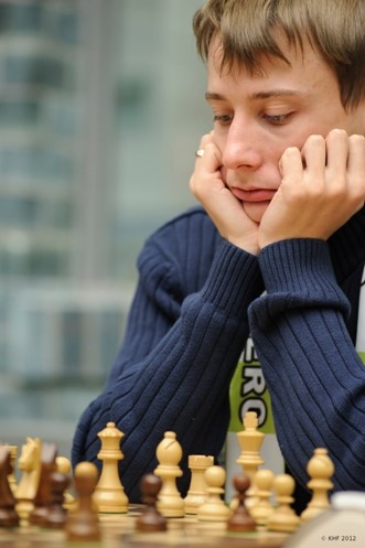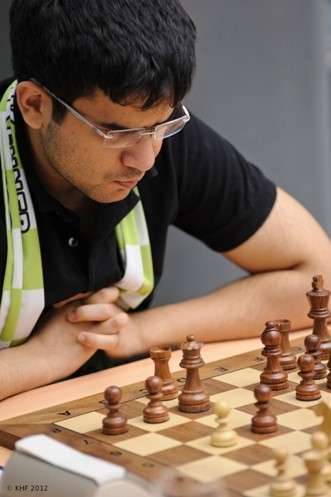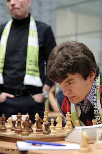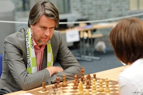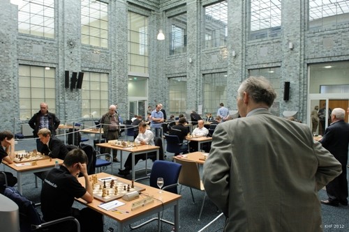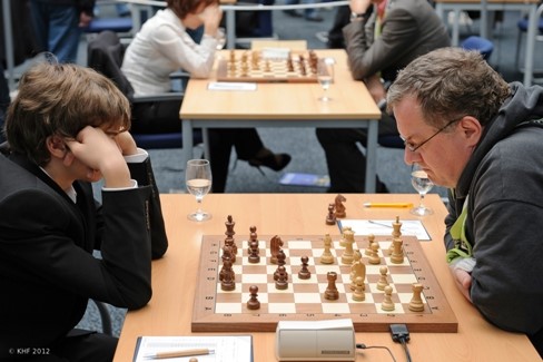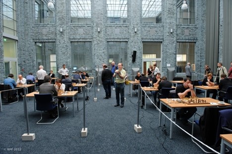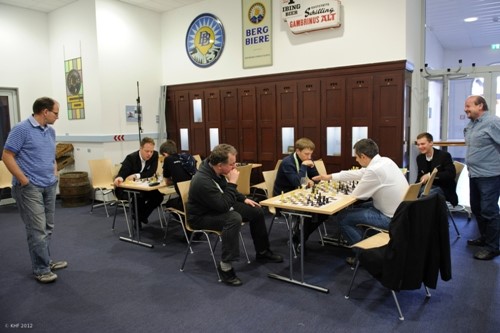 Um 16.00 Uhr registrierte ich zum ersten Mal, dass Nazar aufstand und durch den Saal spazierte. Eigentlich ein sicheres Zeichen dafür, dass er sich recht wohl in seiner Haut fühlt. Und tatsächlich: Die Position trug jetzt taktische Züge und das ist genau das Fahrwasser, das unser ukrainischer Zocker braucht. Ansonsten befand sich die überwiegende Mehrheit der Partien im Aggregatszustand zähes Gewürge. Hier und da meinte ich zwar kleine Vorteile zu erahnen aber das war alles noch kaum greifbar. Ein wenig später stellte allerdings Matthias seinen Gegner vor eine prinzipielle Entscheidung und strukturelle Probleme, die ihm in der Folgezeit zunächst einen Mehrbauern einbrachten. Während dessen wurde es auch bei Evgeny taktisch. Sein Gegner opferte etwas zweischneidig und unser Newcomer musste sich nachfolgend wirklich umsichtig verhalten. Parallel dazu erspielte Nazar einen Qualitätsgewinn und Matthias holte sich den zweiten Bauern ab. Als dann auch noch Parimarjan eine Figur gegen zwei Bauern gewann, hatte ich eigentlich ein gutes Gefühl für den weiteren Kampfverlauf. Später verhedderten sich allerdings die Materialverhältnisse bei unserem Vorzeigeinder und er musste sich fortan mit einem komplizierten Endspiel (Läufer und Springer gegen Turm) auseinander setzen. Unterdessen ergab sich bei Klaus, der ein bisschen unter einer Erkältung litt, ein schwerblütiges Turmendspiel. Er musste fortan ums Remis kämpfen.