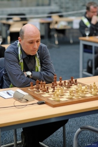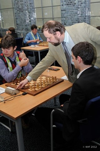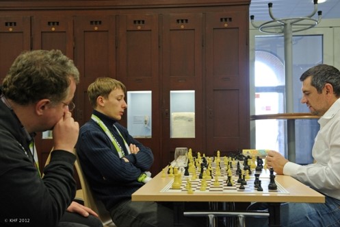 Berichtenswert ist auch, dass Evgeny nach dem ersten Zug seines Gegners in tiefes Grübeln verfiel. Während dessen hielt ich gerade einen netten Plausch mit Evgeny Postny, der mit einem breiten Grinsen anmerkte, dass sein Namensvetter jetzt offenbar die Schachgötter um Beistand anflehe.
