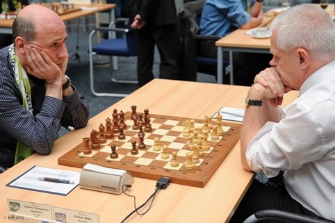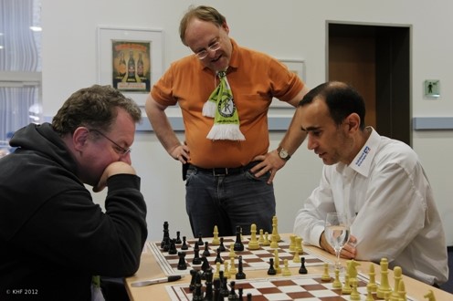 Das nächste Ergebnis sicherte sich dann Yurij, der praktisch ungefährdet remisierte (1,5-1,5). Nicht ganz so erfreulich war allerdings, dass sich Vladimir wieder einmal in hochgradiger Zeitnot befand. Er hatte zeitweise nur noch wenige Sekunden auf der Uhr. Irgendwie scheint er diesen Adrenalinschub zu brauchen. Ich könnte hingegen gut ohne solche Aufregung leben. Ebenso unerfreulich war die Tatsache, dass sich Klaus urplötzlich einen Qualitätsverlust einhandelte. Das konnte eventuell eine unangenehme Vorentscheidung für den weiteren Kampfverlauf bedeuten. Derweil versuchte Parimarjan bei seinem Landsmann mit einem Remisangebot zu landen. Klappte aber nicht. Nazar konnte sich hingegen das Remis sichern (2-2). Auch diese Partie war irgendwie nie gefährdet. Kurz danach bestätigten sich jedoch meine Ahnungen. Klaus musste aufgeben und Eppingen ging zum ersten Mal in Führung (2-3). Kurz nach der 1. Zeitkontrolle liefen also noch drei Partien: