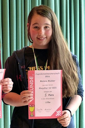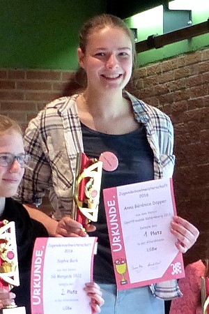 Anna Bérénice Döpper war durch die vorher gespielten 13 Turnierpartien nicht ermüdet, sondern gut eingepielt: Wie Isabel verlor sie in der U18w nur gegen die Setzlistenerste Sophie Bork (Dortmund) und gestaltete alle übrigen Partien siegreich. Da Sophie aber insgesamt drei Remisen abgab (darunter eines gegen Melanie, die somit wertvolle Schützenhilfe für Anna leistete!), reichten Annas 6:1 Punkte gar zum ersten Platz. Klar, dass sie als NRW-Meisterin ebenfalls mit nach Willingen zur Deutschen Jugendmeisterschaft fährt.