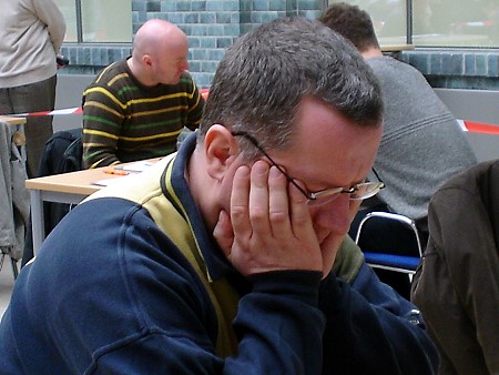 Wollte Georgios Souleidis demonstrieren, dass die Stimmung im Team auch nach den zwei Niederlagen dieses Wochenendes keineswegs im Keller ist? Oder tröstete er sich nur mit dem Gedanken, dass Schach im Leben eines Mannes nicht Alles ist??? Egal - gegen Eppingen schrammte unsere Mannschaft nur knapp an einem Punkt vorbei, sogar ein Sieg wäre nach dem Spielverlauf nicht unverdient gewesen. Und gegen die Übermannschaft des OSG Baden Baden konnten sich immerhin drei Katernberger über Teilerfolge freuen.