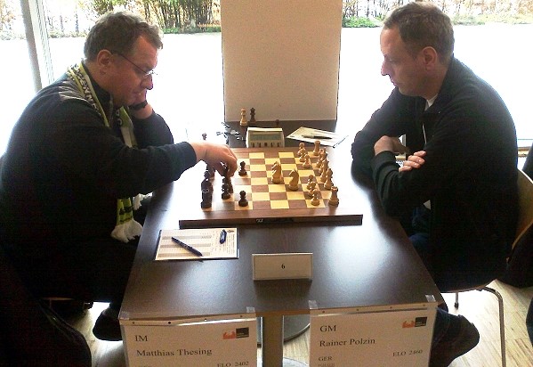 Aus der Eröffnungsphase stach lediglich die sizilianische Abtauschorgie der Partie Polzin – Thesing heraus, die mit merkwürdigen Stellungs- und Materialverhältnissen verblieb. Das musste man weiter beobachten. Bemerkenswert war auch die Igelstellung von Klaus Bischoff. In Kennerkreisen heißt diese Eröffnung ja übrigens auch Hippopotamus- oder Nilpferd-Variante; nicht, weil sie so genügsam wäre, sondern weil der Schwarze hier aus einer gesicherten Stellung kräftig zubeißt.
