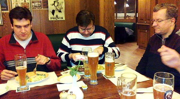 Es macht Sinn, vor Ort zu essen, um nicht noch Umwege und Zeitverluste in Kauf nehmen zu müssen. Man hatte uns sogar in einem Extraraum des Restaurants einquartiert. Dort war auf vielen Bildern die Geschichte des Bierbrauens dargestellt. Man sieht: Völkerverständigung beginnt beim Bier im Hofbräuhaus. Hopfen und Malz – Gott erhalt’s! Oans, Zwoa, Gesuffa!
