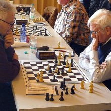 Zweite Überraschung war die Niederlage von Helmut Schorra an Tisch 6 gegen Uwe Nebel (SG Drewer 1954). Erich Krüger kam - wie auf dem Foto vielleicht gut zu erkennen - gegen Tomislav Dulovic grade noch mal so davon, nachdem er sich gegen Matt- und Dauerschachdrohungen mühsam wehren konnte. Erst nach einem nicht notwendigen Damentausch gelang ihm die Befreiung in ein Endspiel mit entferntem und Sieg bringendem Freibauern.