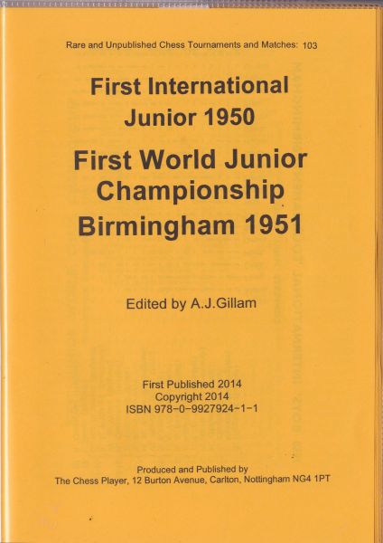 Das Turnierbuch zu den beiden Turnieren „First International Junior 1950“ und „First World Junior Championship 1951“ ist Mitte 2014 als Nr. 103 der Reihe „Rare and Unpublished Tournaments and Matches“ bei dem auf Schachhistorie spezialisiertem Verlag „The Chess Player“ erschienen [http://www.chessbooks.co.uk/Chessplayer.html]. Die äußere Aufmachung des sehr handlichen Turnierbändchens ist minimalistisch („stapled booklet in plastic sleeve“), enthält aber außer unterhaltsamen historischen Hintergrundinformationen fast alle Partien des 1951-er Turniers. Dem Editor J.A. Gillam darf man große Anerkennung für diese Arbeit aussprechen.