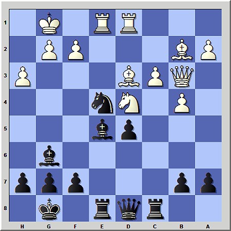 Für den ersten Sieg hatte ich selbst gesorgt, allerdings auf ausgesprochen kuriose Art und Weise: Nach zu schematischer Eröffnungsbehandlung meines Gegners konnte ich in der Diagrammstellung ein bereits entscheidendes Opfer anbringen: