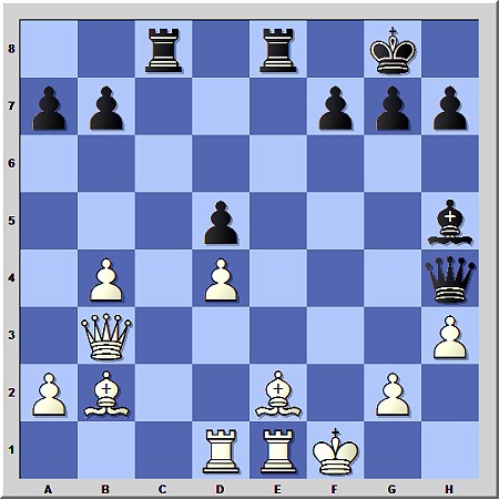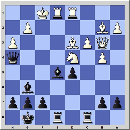 Anstelle nun mit 20...Lxd3+ 21.Txd3 Lxd4 den Schlusspunkt zu setzen, spielte ich 20...Lxd4??, nur um nach 21.cxd4 erschreckt festzustellen, dass nun die weiße Dame den Ld3 verteidigt. Mit einer Figur weniger sollte Schwarz hier aufgeben, aber dazu konnte ich mich dann doch nicht entscheiden und spielte 21...Lh5. Nun war es an meinem Gegner, fehlzugreifen. Viele Züge sind hier möglich, nicht aber 22.Le2??