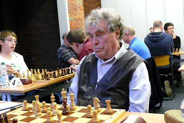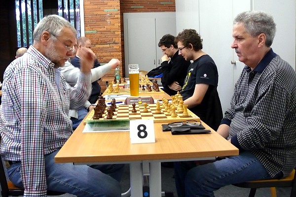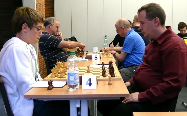 Edwin Otremba spielte ausgerechnet gegen den Super-Taktiker Maximilian Heldt taktisch waghalsig und musste schnell die Segel streichen. Ersatzmann Friedel Dicks spielte eine blitzsaubere Partie gegen Achim Kühn - 2:0. Tim Dette konnte seine gefährdete Partie gegen Dieter Przygoda Remis halten, und auch Michael Wolff kam gegenm Jürgen Kraft nicht über ein Remis hinaus: 3:1. Kurz vor der Zeitkontrolle stellte Volker Schlepütz gegen Stefan Zell eine Figur ein - 4:1. Stefan Krückhans wickelte eine ursprünglich sehr bequeme Stellung zu einem vermeintlich gewonnenen Bauernendspiel ab. Lukas Schimnatkowski hatte allerdings besser gerechnet, fand die richtigen Bauernzüge und brachte seinen Gegner in Zugzwang -5:1. Jan Dette verwertete Mehrbauern plus Läuferpaar gegen Rolf Weber (6:1), und Clemens Waidelich überstand die Gegenoffensive von Herbert Schmitthöfer mit dem Glück des Tüchtigen - 7:1