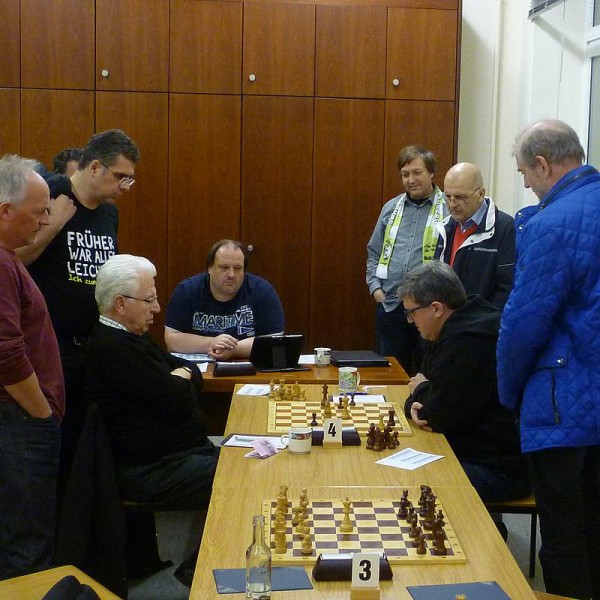 Erich stand nach einem gegnerischen "klassischen" Eröffnungsfehler im Damengambit schon nach 10 Zügen auf Gewinn und an den Brettern 5-8 waren wir sehr gut aus den Startblöcken gekommen: Bruno mit zumindest optisch schönem Positionsvorteil gegen einen "Grünfeld-Slaven"; Holger in einem Kasparov-Gambit mit starker Angriffsstellung gegen den weißen König; Jan mit positionell überlegenem Leningrader Angriff und resultierendem Bauerngewinn; Jürgen [Riesenbeck] ebenfalls mit einem Mehrbauern und positionellem Übergewicht. Ich rechnete mir gedanklich schon einen 5:3-Sieg aus! Leider kam es dann doch etwas anders.