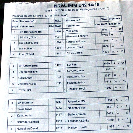 Das gleiche Bild gegen Paderborn: Noel siegte diesmal souverän gegen Moritz Brockhoff (DWZ 1584), und Isabel ließ Noah Stirnberg (DWZ 1681) in einem gewonnenen Turmendspiel noch ins Remis entschlüpfen. Aber in der dritten Runde war es dann soweit: Der Mitfavorit TUS Ende wurde mit 3:1 bezwungen. Den Grundstein legte Jan, den ich erst zwei Tage zuvor in der Schach-AG des Leibniz-Gymnasiums rekrutiert und im Verein angemeldet hatte: Er setzte seinen Gegner, der zu begierig auf Bauernjagd gegangen war, kurzerhand Matt. Kurz darauf erhöhte Luca auf 2:0, nachdem sein Gegner einen ganzen Turm eingestellt hatte. Verbissen kämpften die Spitzenbretter von TUS Ende gegen die drohende Niederlage an, erst nach Ablauf der 4. Spielstunde endete der Kampf: Noel musste sich dem gegnerischen Läuferpaar geschlagen geben, aber Isabel profitierte davon, dass Lenhard Biermann (DWZ 1703) in Zeitnot eine Figur einstellte. Damit war plötzlich sogar die Qualifikation zur Deutschen Meisterschaft möglich.