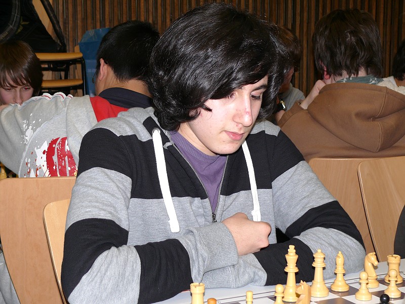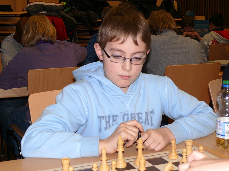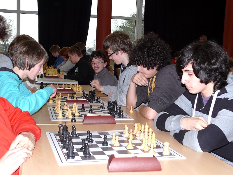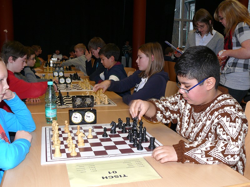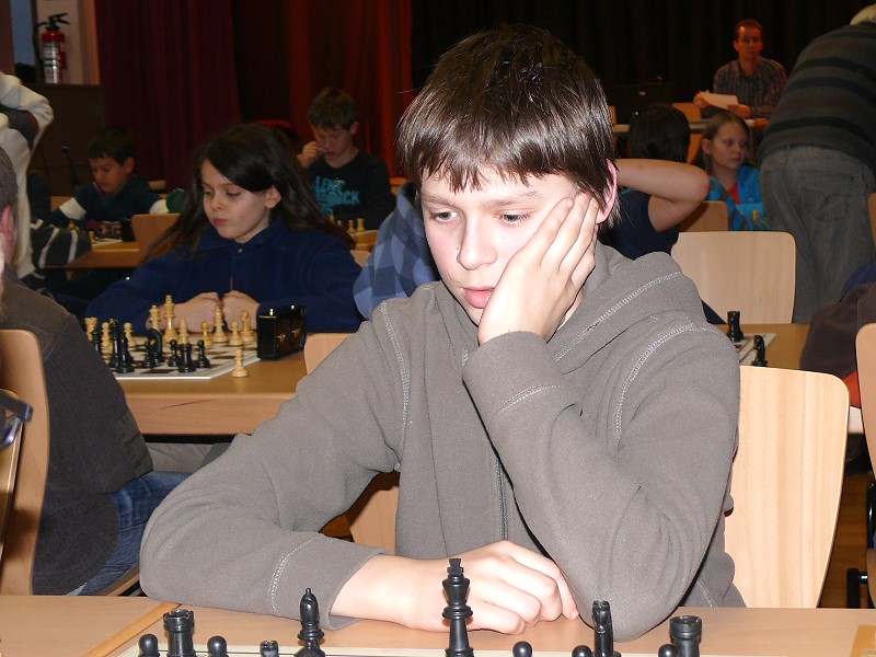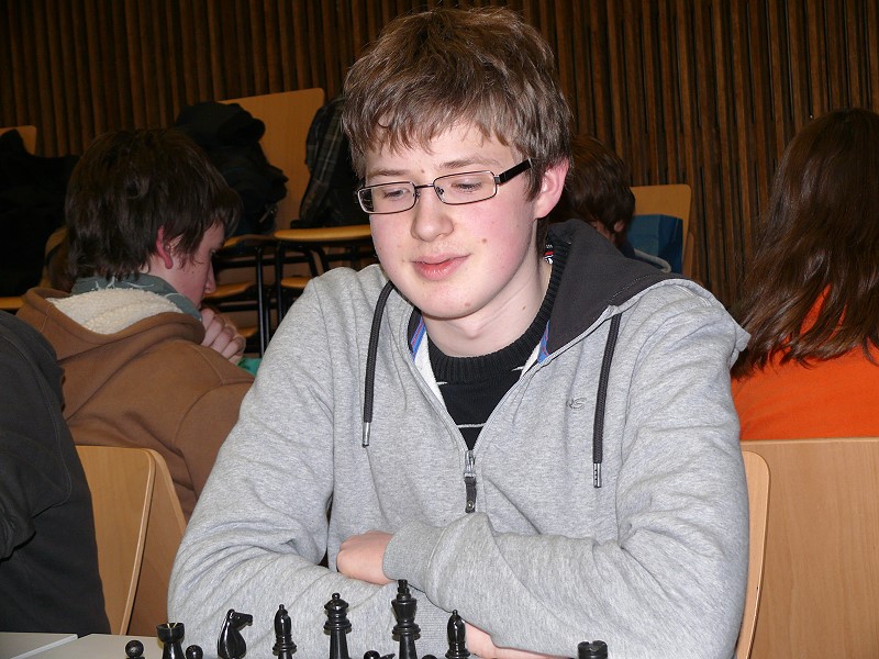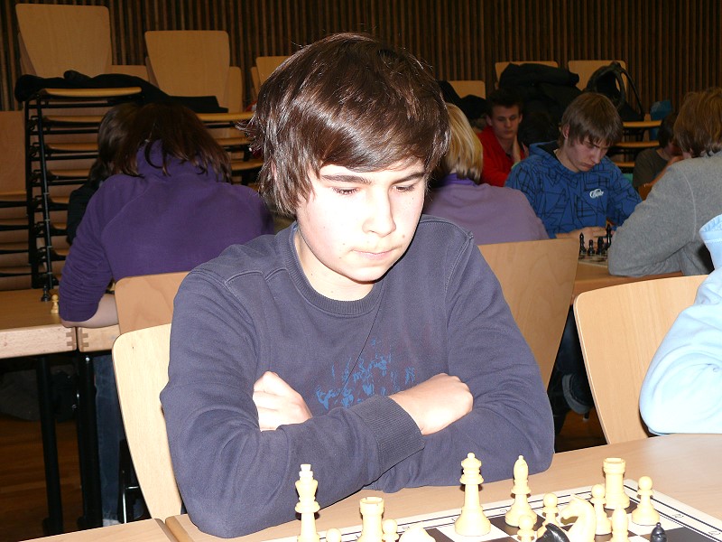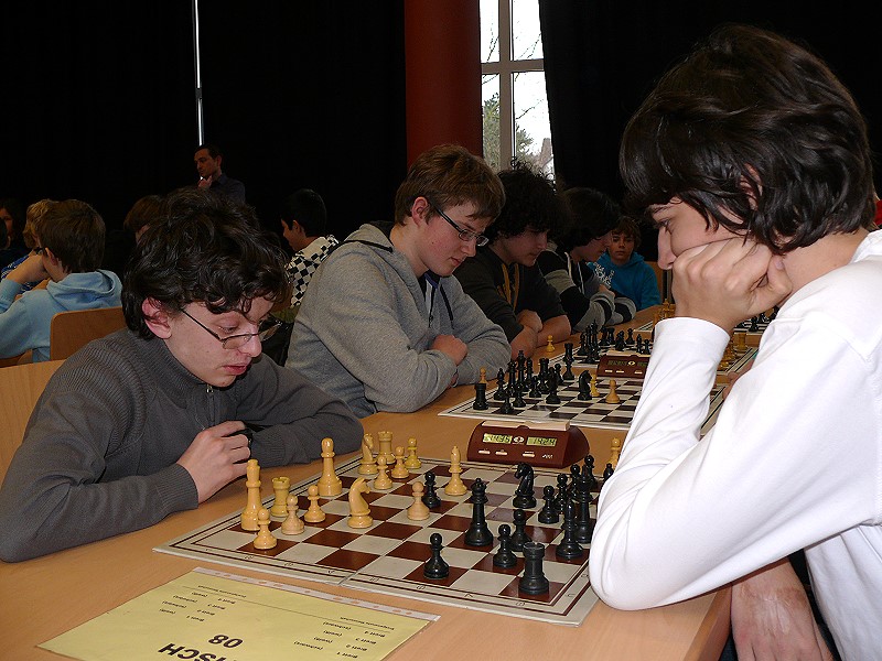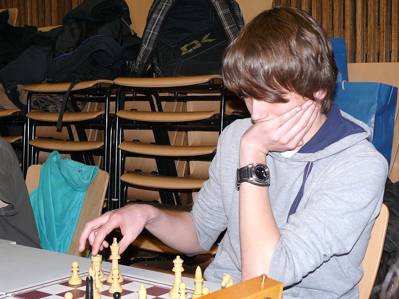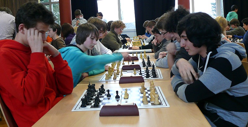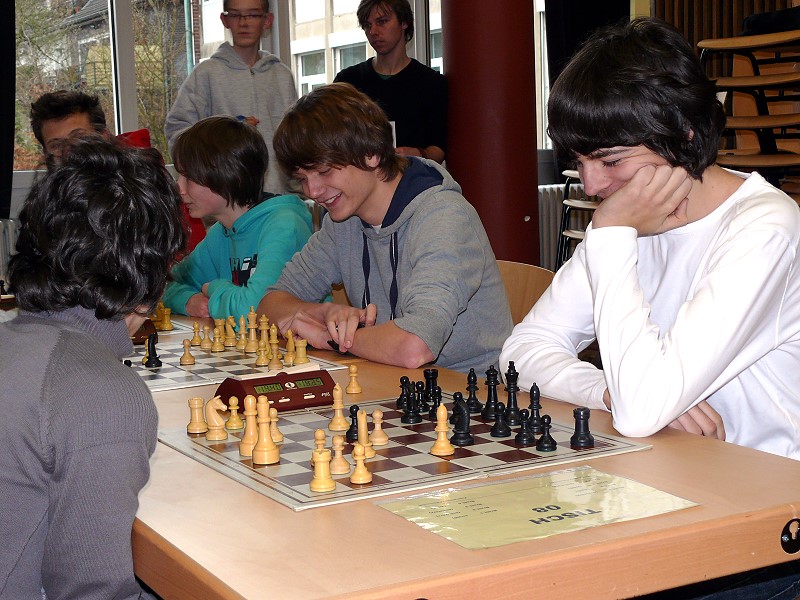 Ausgesprochen stark besetzt war die WK I (Jahrgang 1994 und jünger), wo sich neben der Leibniz-Auswahl (mit Jan Dette und André Kolbe an den Spitzenbrettern) noch das Burg-Gymnasium (mit den vier SFK-Spielern Maximilian Heldt, Michael Dohmen, Arman Marvani und Armin Ghadiri-Oghan) und die Realschule Schloss Borbeck Titelchancen ausrechneten. Gleich die erste Runde bescherte Leibniz einen hart umkämpften 2,5:1,5 Sieg gegen das Burg-Gymnasium: Das ewige Duell zwischen Maximilian und Jan endete auch diesmal unentschieden, Michael verlor gegen André auf Zeit. Nach zwei klaren Siegen kam die Mannschaft gegen Schloss Borbeck nicht über ein 2:2 Unentschieden hinaus, obwohl Jan den Essener U18-Meister Marcel Ranz in einer hochklassigen Partie bezwingen konnte: Gleichstand!