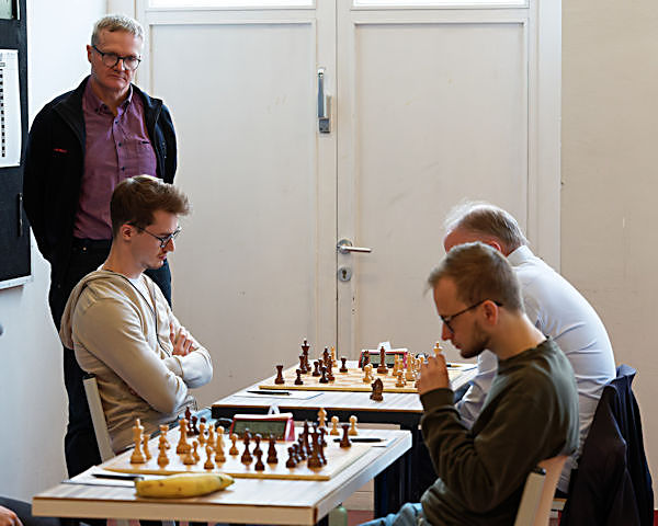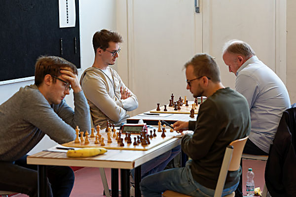 Der Kampf begann denkbar schlecht: Benjamin, der in der letzten Saison noch so zuverlässig gepunktet hatte, musste nach nicht mal 20 Zügen nach einem groben Fehler die Waffen strecken. Und es ging schlecht weiter: Jan landete aus der Eröffnung heraus, in der er einen Bauern geopfert hatte, in einem Turmendspiel, in dem er immer noch einen Bauern weniger hatte. Noel hatte ebenfalls einen Bauern geopfert, stand dafür aber riesig - und verlor erst den Faden und dann die Partie. Thomas wähnte sich - vielleicht zu Recht - im Vorteil, kassierte dann aber ein 2zügiges Matt. Dass der Kampf am Ende dennoch nicht verloren ging, haben wir vor allem unseren beiden Spitzenbrettern Timo und Lukas zu verdanken: