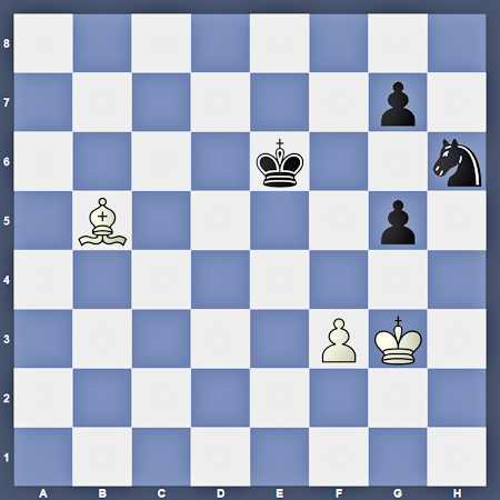Damit schien der Kampf jedoch gelaufen, denn Lukas führte in der nebenstehenden Stellung die weißen Steine. Der Mehrbauer ist für Schwarz natürlich nicht zu verwerten - hierfür müsste Schwarz den Bf3 erobern, was schlechterdings unmöglich ist. Lukas hatte deshalb auch schon Remis angeboten, aber sein Gegner verspürte wohl noch eine gewisse Spielfreude. In den letzten rund 20 Zügen war schon viel hin und her gezogen worden, ohne dass ein Bauer sich bewegt hätte. In der Diagrammstellung zeigt sich dann, dass Schwarz die Partie zwar nicht gewinnen, sie aber immer noch verlieren kann. Und tatsächlich - nachdem der schwarze Springer erst vor wenigen Zügen nach h6 beordert worden war, begab er sich nun auf den Weg nach f6. Über welches Feld führt ihn der Weg dahin? Und warum wird er sein Bestimmungsfeld nie erreichen?