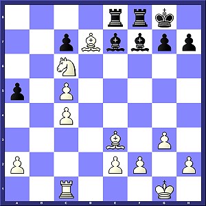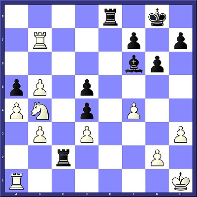 Überraschend schnell gelang mir in Runde 5 ein Sieg gegen den Holländer Jan Balje, der mit ELO 2244 in der Setzliste direkt hinter mir auf Platz 6 rangierte. Nach 1.c4 überraschte er mich mit dem von ihm laut Datenbank noch nicht gespielten 1...e5. Aus Furcht vor der gegnerischen Vorbereitung konterte ich mit 2.a3!? - gleichzeitig natürlich ein Tribut an Anna, die immer wieder schon im 1. Zug zu diesem bescheidenen Randbauernzug greift. Im weiteren Verlauf erreichte ich zunächst eine Stellung, in der mir der zusätzliche Zug a3 das aktive b2-b4 mit Angriff auf den Lc5 ermöglichte, und nach einer ungewöhnlichen Springerwanderung über das Feld a6 krachte die schwarze Stellung plötzlich zusammen: