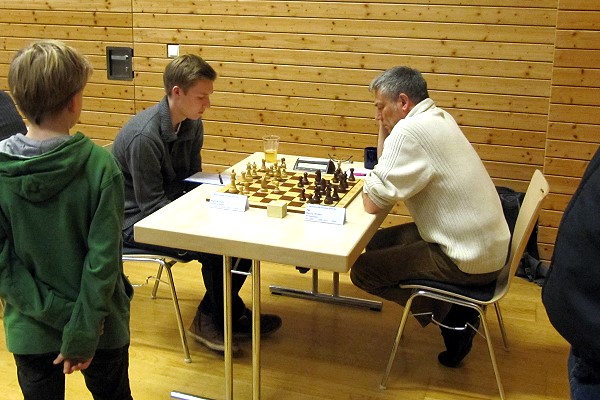 Der erste Tag begann mit einer angenehmen Überraschung: Als Schiedrichter fungierte mit Dr. Johannes Baier nämlich ein weiterer guter Schachfreund aus NRW, der ebenfalls an besagtem B-Trainer-Lehrgang teilgenommen hatte, den Rekrutierungskünsten von Olaf Nevermann ebenso wenig gewachsen war wie ich und das Turnier bereits zum dritten Mal leitete. Wenig Aufregendes dann in der 1. Runde: Anna siegte schnell gegen die Nr. 94 der Setzliste ("die letzte Teilnehmerin mit Wertungszahl!"), ich konnte mich gegen einen anderen Jugendspieler ebenfalls leicht durchsetzen. Schon am Nachmittag ging es weiter, denn das stramme Turnierprogramm sah insgesamt drei Doppelrunden vor. Ich musste gegen den Jugendmeister des ausrichtenden Vereins antreten und wurde noch gewarnt: "Patrick hat sich echt was vorgenommen - der ist vor allem im Endspiel stark!" Nachdem ich es versäumt hatte, schon in der Eröffnung den Sack zuzumachen und im Endspiel leichtfertig einen Bauern geopfert hatte entstand tatsächlich eine sehr spannende Partie, die ich nur mit purem Glück gewinnen konnte. Hier möchte ich nur zwei Momentaufnahmen zeigen: