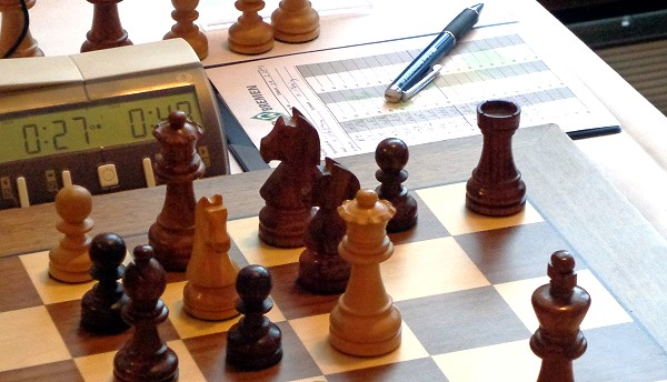 Ein (zugegeben) oberflächlicher Blick auf die Bretter zu Beginn der 2. Spielstunde ließ mich dann mit dem Eindruck zurück, dass wir in der Gesamtschau eigentlich gar nicht so schlecht standen. Allerdings befand sich Evgeny unter Druck, wobei er leider nicht nur gedrückt stand, sondern neben seinem Entwicklungsnachteil auch noch eine Turmverdoppelung auf der d-Linie ertragen musste. Schwere Kost! Aber – wie ich später erfuhr – moderne Theorie.