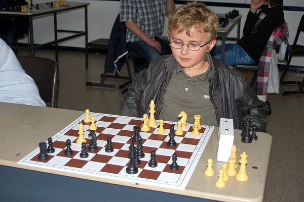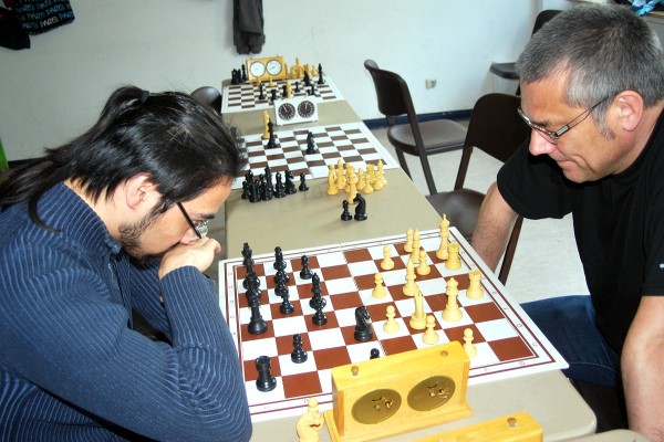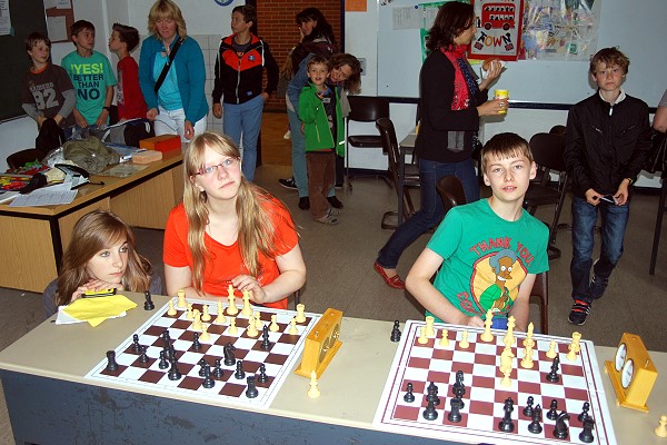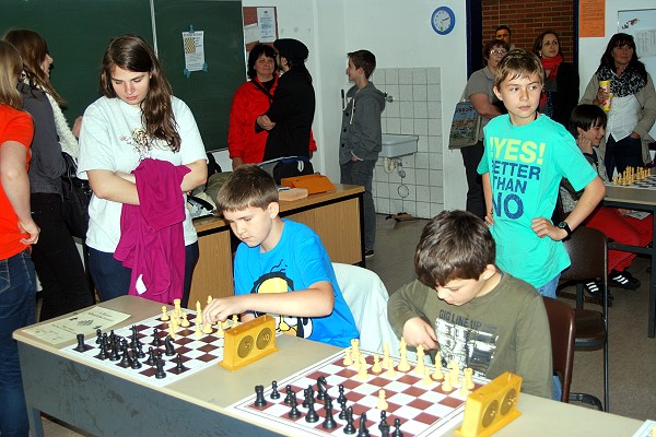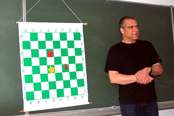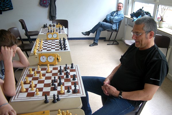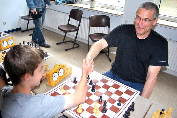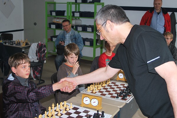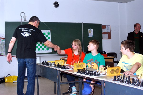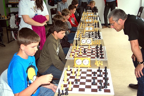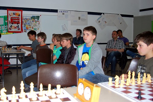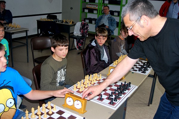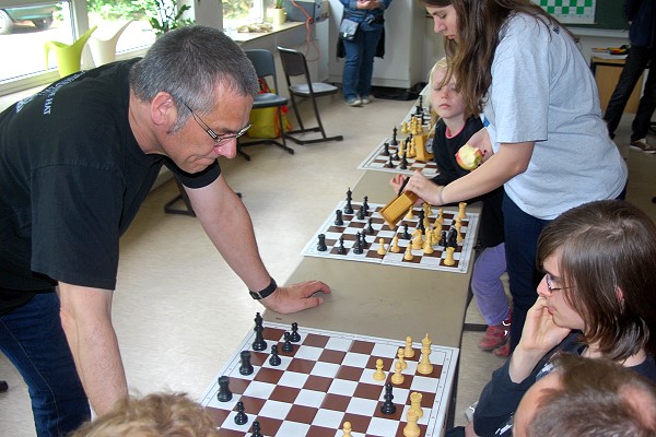 Das Duell mit den Schülern entschied Rosen dank guter Züge und schneller Beinarbeit vor zahlreichen Zuschauern klar für sich: In zwei Durchgängen spielte er jeweils gegen 6 Gegner gleichzeitig, hatte dafür jedoch nur 20 Minuten Bedenkzeit zur Verfügung. Der Bundesligaspieler siegte in 11 Partien, Natascha Hofer gelang das einzige Remis durch ein schön herausgespieltes Dauerschach.