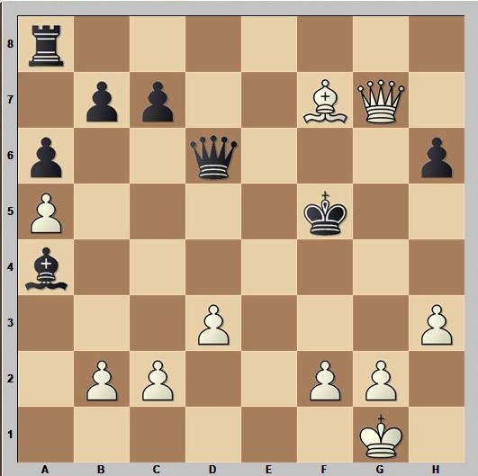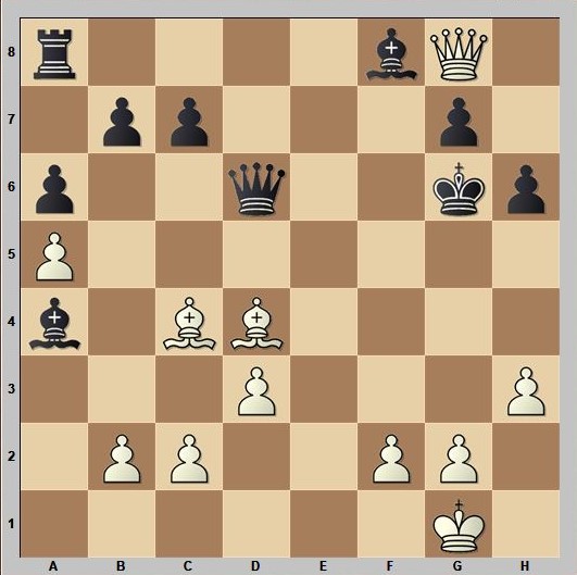 Der Partiezug war 28…Kg5, wonach 29.Le4 das gegnerische Schiff versenkt, 1-0 (29…Kf4 30.Dg3# oder 29…Kh4/5 30.Dg4#). Die Schönheit der Stellung liegt natürlich darin, dass Schwarz den Lg6 nicht besonders gut schlagen kann: Auf 28…Dxg6 folgt 29.g4+! Kg5 und 30.h4+ mit Damengewinn und weiterem Mattangriff.