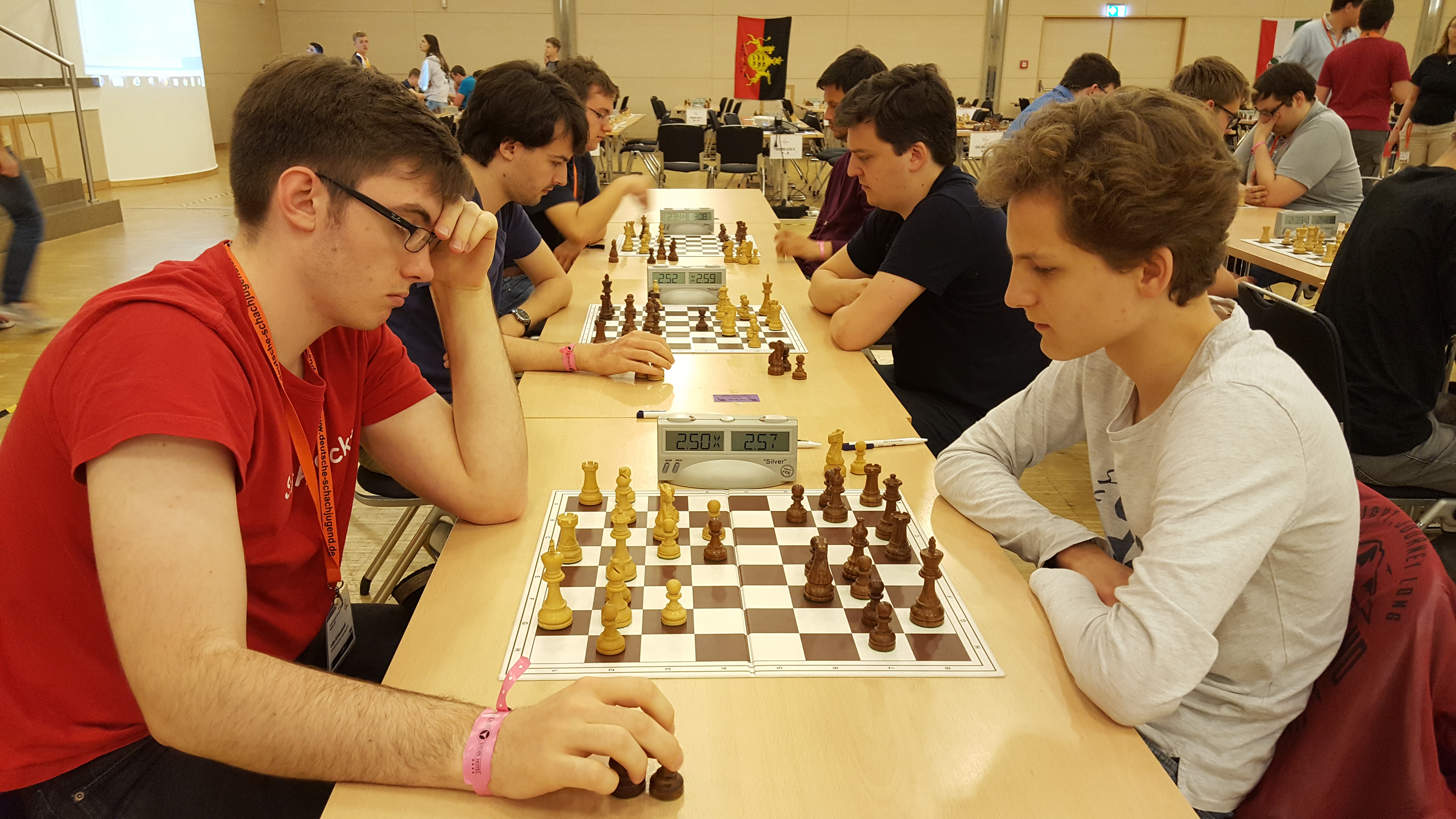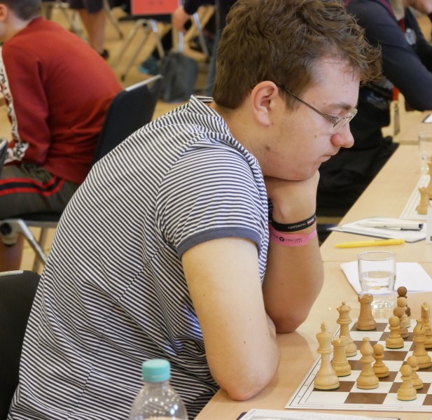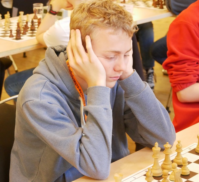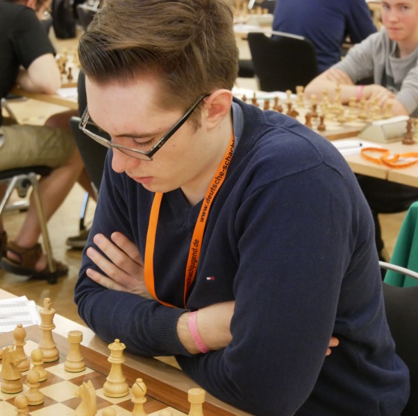 Der Einstieg ins Turnier begann bereits mit einer Doppelrunde. Die Veranstalter wollten die Teilnehmer wohl gleich richtig ins Schwitzen bringen?! Als Vorletzter der Rangliste war es für Lasse von Anfang an besonders schwierig, in dem anspruchsvollen Teilnehmerfeld mithalten zu können. In der ersten Runde musste er in ungewohnten Fahrwasser des Nimzoindisch seine Dame für zwei Springer abgeben, um nicht in das vermeintliche Mattnetz zu tappen. Dann die herbe Enttäuschung aus spielerischer Sicht: Gleich in der zweiten Runde „musste“ Lasse einen spielfreien Punkt einkassieren, sodass seine folgenden Gegner nicht weniger starkes DWZ-Kopfgeld aufweisen würden. Kein leichter Start für eine erste DEM-Teilnahme.