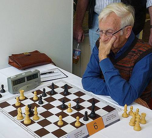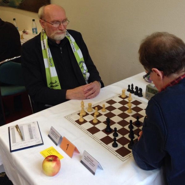 Bruno Müller-Clostermann schaffte nach dem schon erwähnten Kurzremis gegen Erich einen vollen Punkt gegen Vorjahressieger Arvid Grahl - Partie siehe unten - (Zwischenbilanz also 4,5/5) und hielt sich einige Runden an Tisch 1. Die Wende zum Schlechteren ergab sich in Runde 8, als ich gegen Gottfried Schumacher mehrfach gute Chancen vergab („drei Elfer verschossen“) und obendrein in Zug 41 in einem Anflug von Schach-Demenz in materiell und positionell besserer Position ein Remis durch Stellungswiederholung einem Weiterspielen auf Gewinn vorgezogen habe. In der Schlussrunde gab es mein zweites Kurzremis, dadurch 6,5 Punkte und Platz 7. Die immerhin 30 DWZ- und 38 Elo-Punkte Zuwachs (bei Elo-Performance 2265) waren ein nettes Trostpflaster. Persönliche Zufriedenheitsnote: 2+.