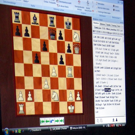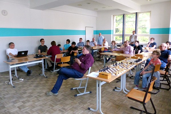 Trotz des langen Fronleichnams-Wochenendes stieß die Präsentation der Partie des Monats Mai auf reges Interesse: Zahlreiche Vereinsmitglieder ließen noch einmal den Sieg von Dr. Thomas Wessendorf im letzten Spiel der NRW-Klasse Revue passieren: Mit seinem Sieg nach 134 Zügen hielt er SFK II wie berichtet in der NRW-Klasse. Als Zugabe gab es noch die mutigste Partie: Jan Dette opferte bei der ODJM in Willingen zwei Türme in einer Partie drei Mal! Wie das geht? Nun - hier sind die beiden Partien zum Nachspielen: