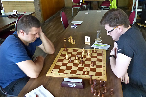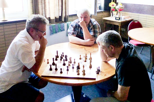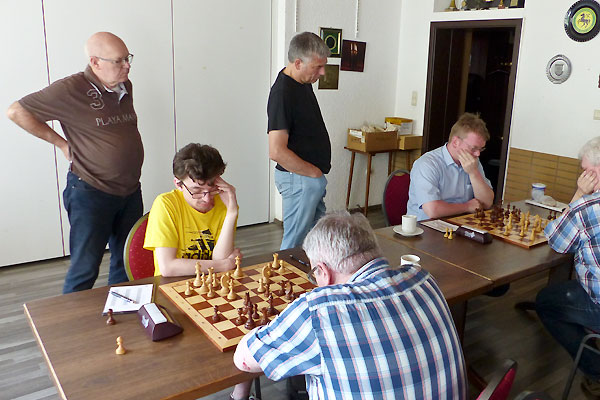 Am Sonntag trafen wir dann auf Kamp-Lintfort, das etwas überraschend gegen Gastgeber Sodingen/Castrop gewonnen hatte. Dass Bosko als einziger Spieler erneut auflief, erklärte ich dem Schiedsrichter damit, dass er am Vortag als Einziger nicht gewonnen hatte. Diesmal wurde er in einen zähen Königsinder verwickelt, in dem er sich mit seinem Angriff am Königsflügel Material gewann, das er dann in einem immer noch komplizierten Endspiel zum Sieg verwertete. Zuvor hatte Martin Villwock am vierten Brett der zähen Gegenwehr seines Gegners Tribut zollen müssen und in den Remisschluss eingewilligt. Mein Gegner ließ sich schon ausgangs der Eröffnung eine Schwäche am Damenflügel andrehen, die sich letzten Endes schon als entscheidend entpuppte. Max musste diesmal gegen den Isolani kömpfen, gewann in der Zeitnotphase eine Figur und steuerte ebenfalls mit einem Sieg bei.