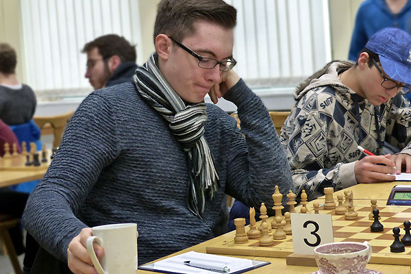 Noel stand von allen Katernbergern sicher am gefährdetsten. Wie so oft hatte er in der Eröffnung sehr viel Zeit investiert, erhöhte aber irgendwann die Schlagzahl. Die Stellung wackelte bedenklich: Sein Sf8 war der letzte Verteidiger gegen das durch Lc2 und d3 ständig drohende Matt auf h7. Doch als auch bei seinem Gegner die Zeit knapp wurde, verschaffte er sich mit einem Qualitätsopfer plötzlich Gegenspiel und seinerseits starken Angriff. Nach der Zeitkontrolle stand er dann sicher auf Gewinn, am Ende landete aber auch diese Partie im Remishafen: 4:2