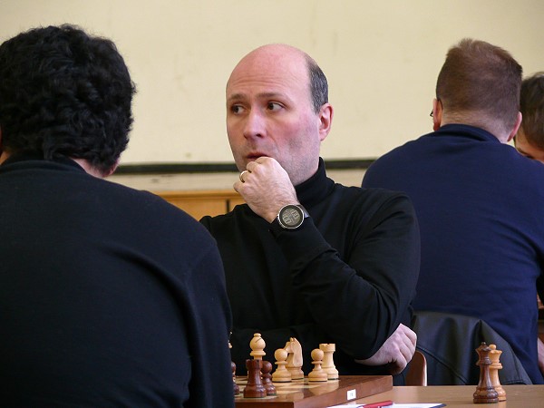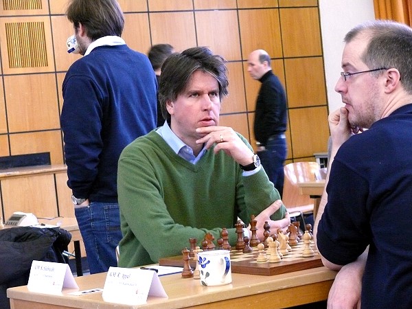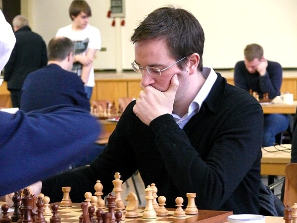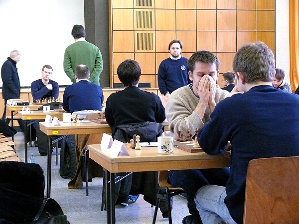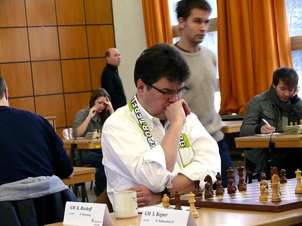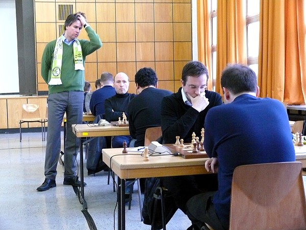 Ein halbes Stündchen später konnte man Robby Ris bei der Belagerung eines gegnerischen Zentralbauern zusehen. Außerdem lies Christian einen Springer in der gegnerischen Stellung explodieren und erspielte sich so eine auf den ersten Blick durchaus dynamische Angriffsposition. Parallel zelebrierte Klaus ein fast schon positionell anmutendes Läuferopfer auf d5. Auch Vladimir wollte offenbar mehr, zumindest lehnte er ein Remisangebot seines Gegners ab.